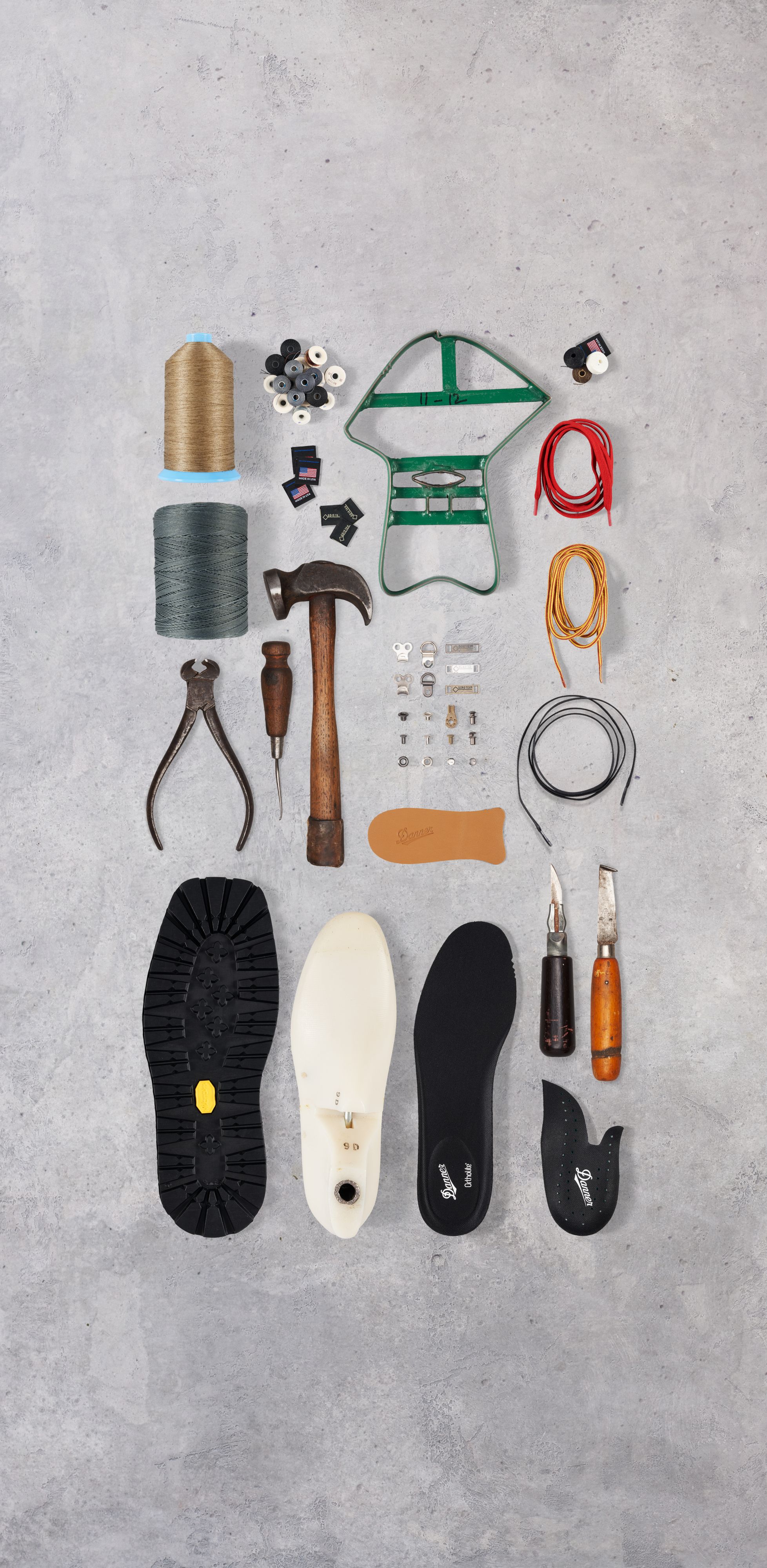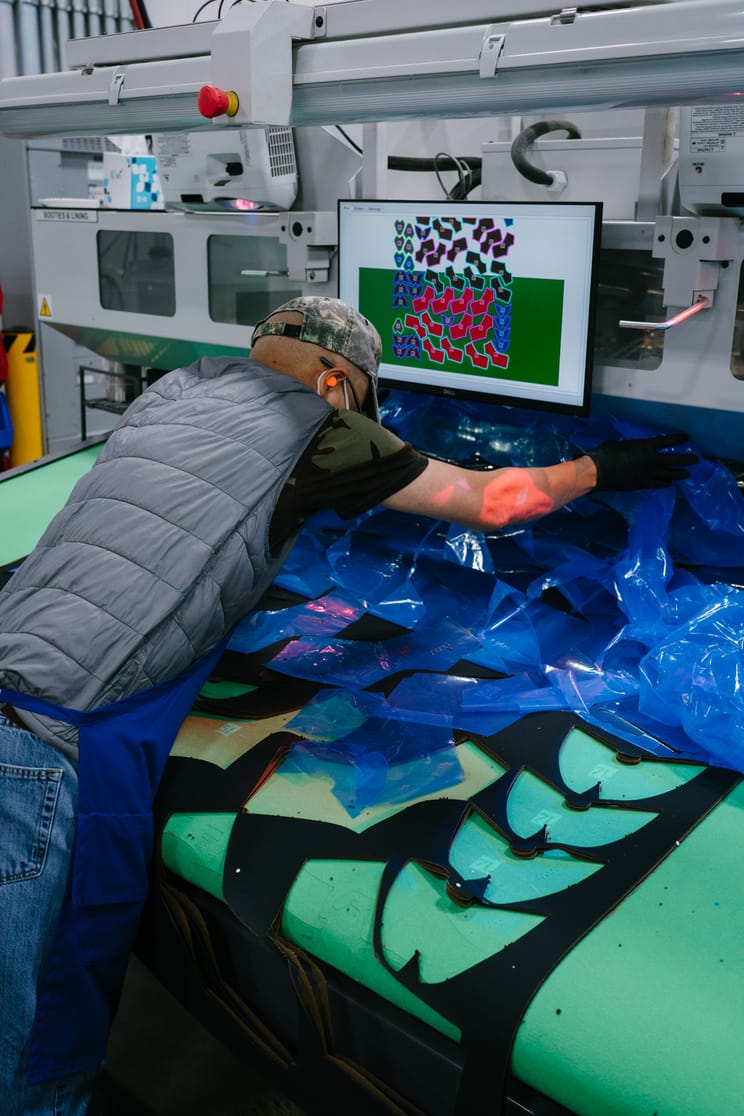Video transitions through various scenes in the Danner boot factory: an overhead view of workers dotted among machines and air vents, a leather specialist inspects a large hide as a computer screen creates a digital map of the hide, and another worker makes small test cuts in a large piece of leather. A close-up view of the edge of a leather hide shows the fibrous texture, and a handheld tool with a circular gauge snaps down on leather. A machine lifts, revealing a Danner logo embossed on brown leather, a boot maker guides a large machine with a flat bottom and stamps it down twice, a pattern maker runs a pencil along the surface, and a worker guides a boot tongue through a sewing machine.